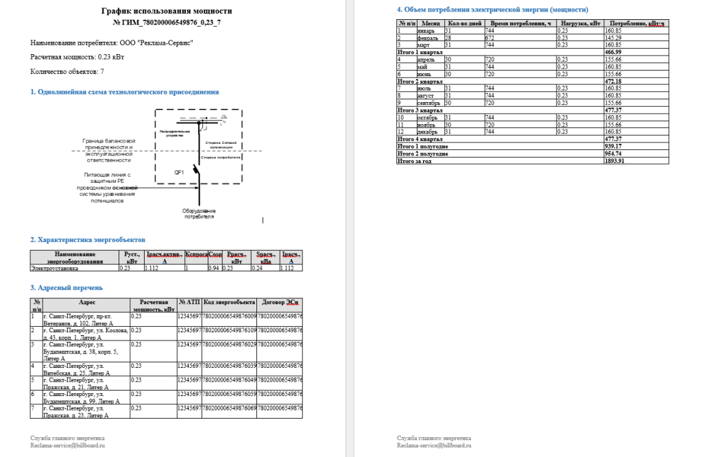 Вывод: Первый блок документа отвечает на вопрос «Кто платит и сколько точек подключения?». Если вы владелец 10 билбордов вдоль трассы, у вас будет аналогичный идентификатор с мощностью, скажем, 0,5 кВт на каждый щит.